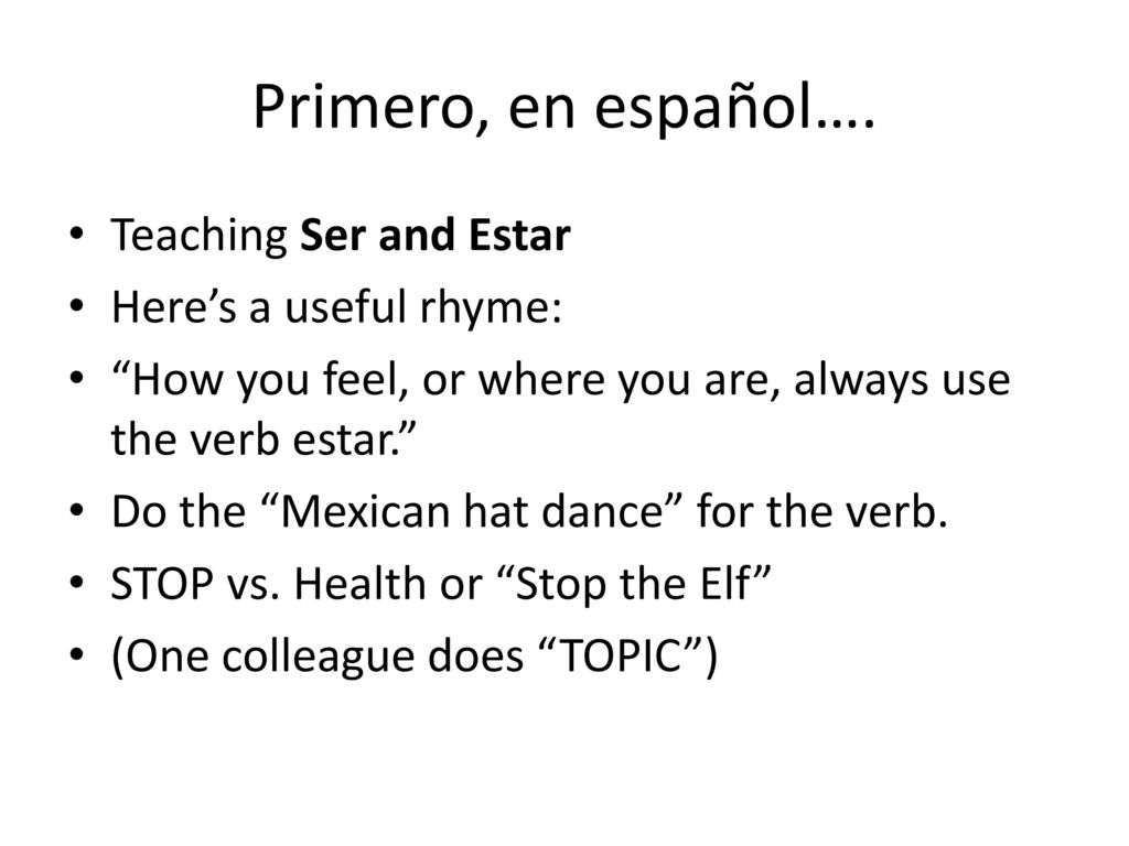 Source google image: https://slideplayer.com/slide/12480657/74/images/2/Primero%2C+en+espa%C3%B1ol%E2%80%A6.+Teaching+Ser+and+Estar+Here%E2%80%99s+a+useful+rhyme%3A.jpg