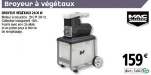 Brico depot broyeur vegetaux Source google image: https://images.folders.eu/image/upload/h_9999,w_350,fl_lossy,q_auto,f_auto,c_limit/v1559798242/live/promobutler/articles/2019/06/06/55065/mac-allister-broyeur-vegetaux-brico-depot-5506523.jpg