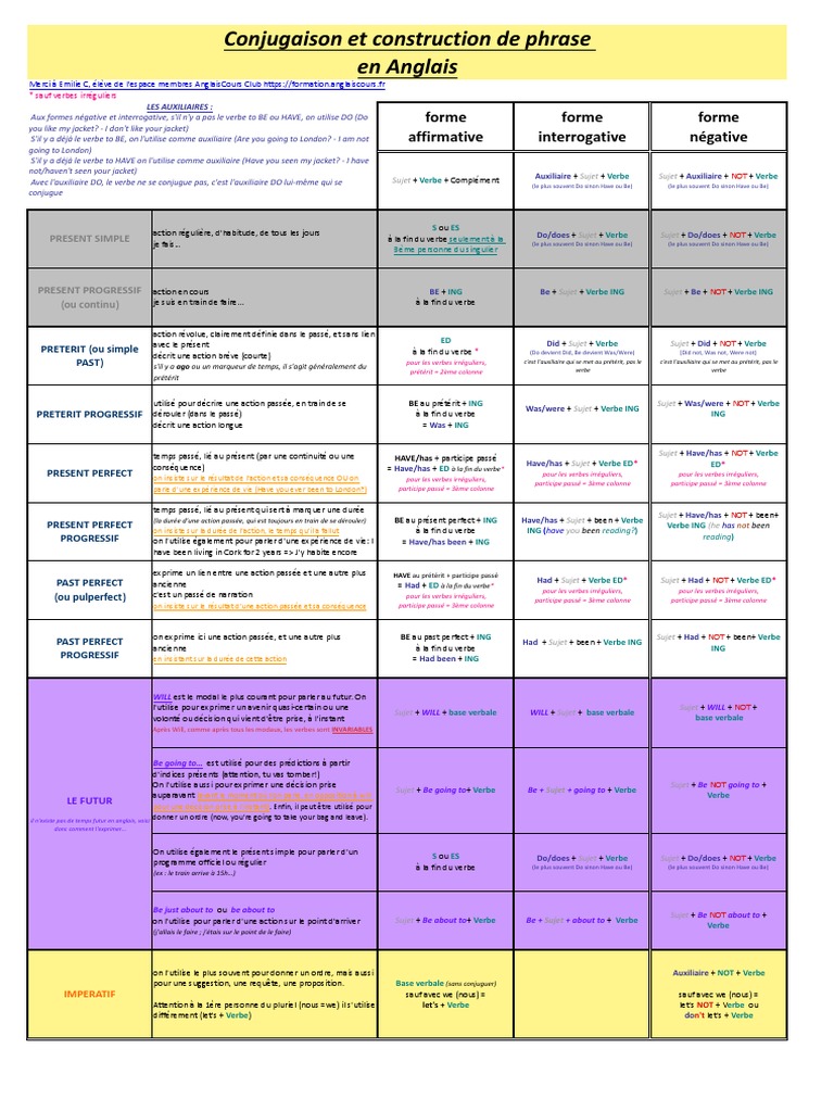 De tous les verbes français est impossible à retenir. Vous y trouverez tous les verbes espagnols conjugués à tous les temps et tous les modes. Comment faire pour choisir le bon? La conjugaison anglaise se caractérise par un nombre limité de formes verbales et une certaine complexité, pour le francophone, quant à l'utilisation des temps.