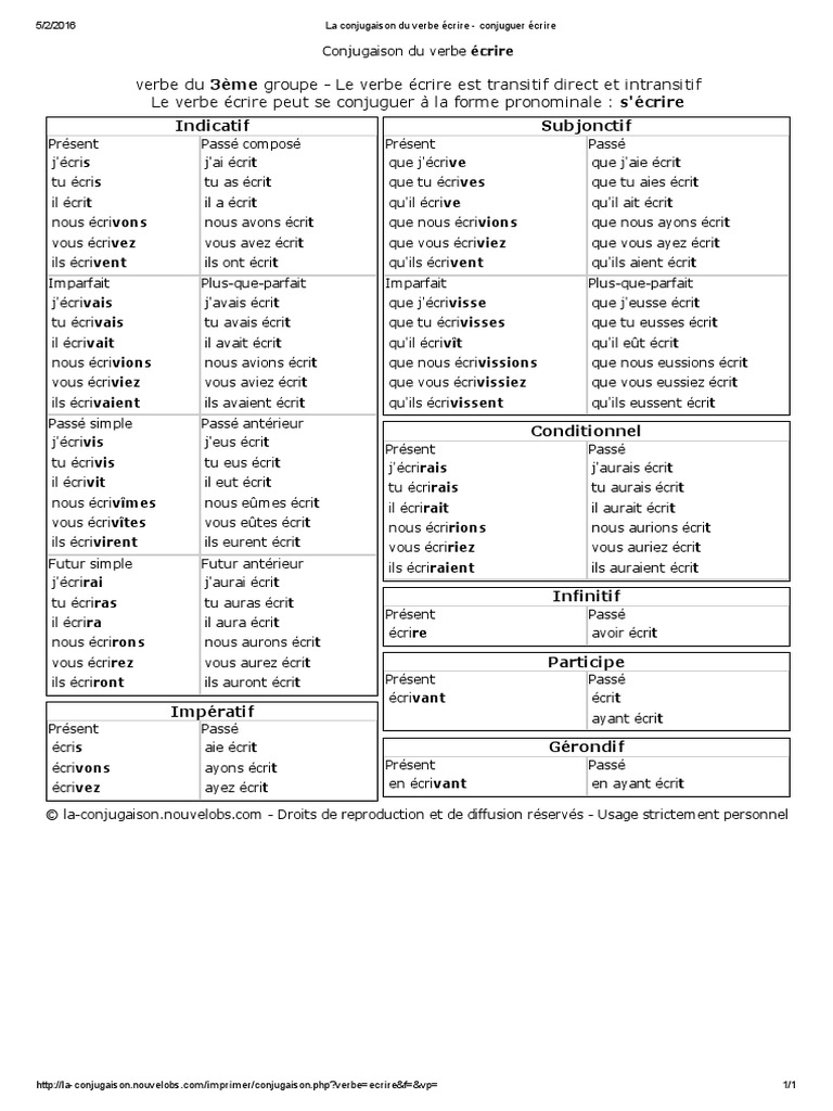imprimer Conjuguer Le Verbe Écrire