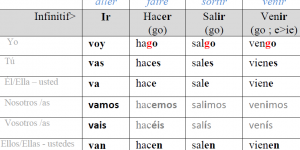 Conjugaison du verbe salir en espagnol Source google image: https://www.superprof.fr/blog/file/2018/03/verbes-irreguliers-espagnol-700×362.jpg